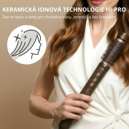 Povrchová úprava Ceramic Hi-Pro a působení iontů vytvářejí rovnoměrné a šetrné teplo, které chrání vlasové vlákno