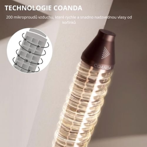 Využívá efekt Coanda k automatickému a jemnému obalení vlasů kolem válců, vytváří výrazné vlny a kadeře rychle a jednoduše, bez nutnosti ručního otáčení